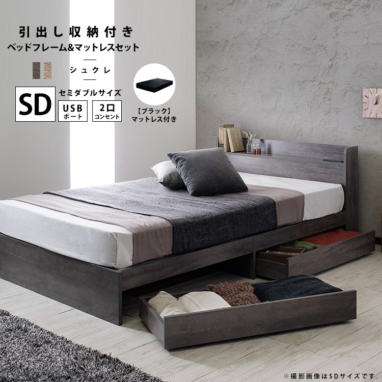 Sucre(シュクレ) 引出し収納付きベッドフレーム ブラックマットセット【セミダブル】